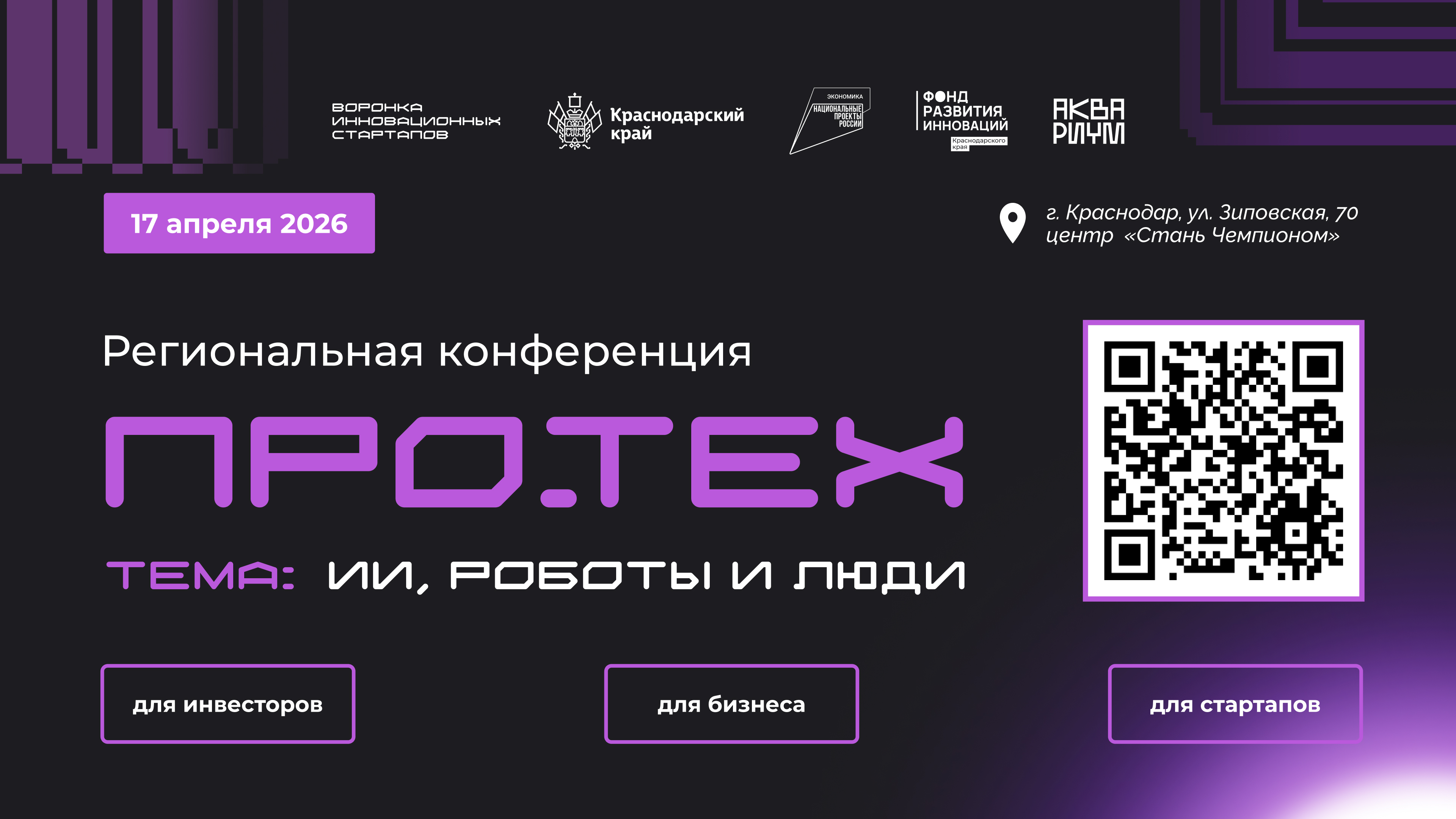 17 апреля 2026 г. в г. Краснодаре состоится седьмая региональная конференция в сфере технологического и инновационного предпринимательства «Про.ТЕХ» (далее – Конференция). Конференция проводится унитарной некоммерческой организацией «Фонд развития инноваций Краснодарского края» при поддержке департамента в рамках участия Краснодарского края в достижении национальной цели устойчивая и динамичная экономика, предусмотренной национальным проектом «Эффективная и конкурентная экономика» (далее – национальный проект).